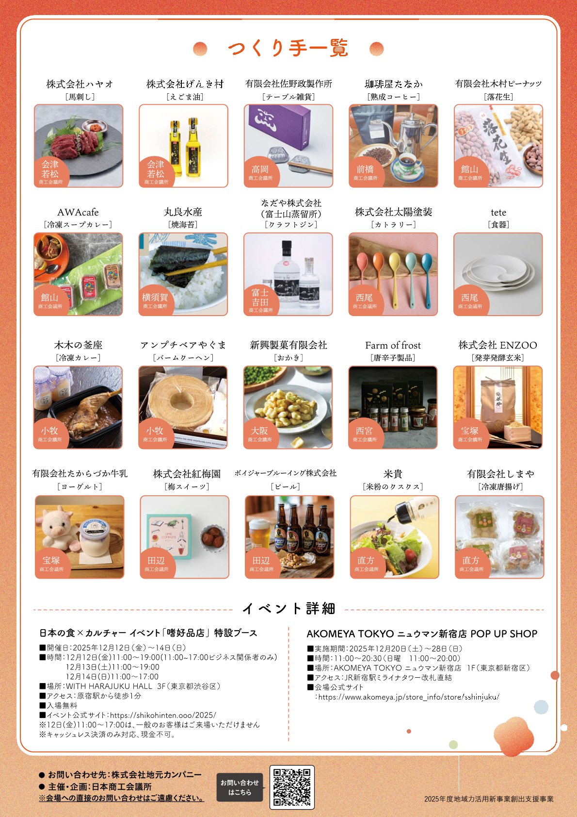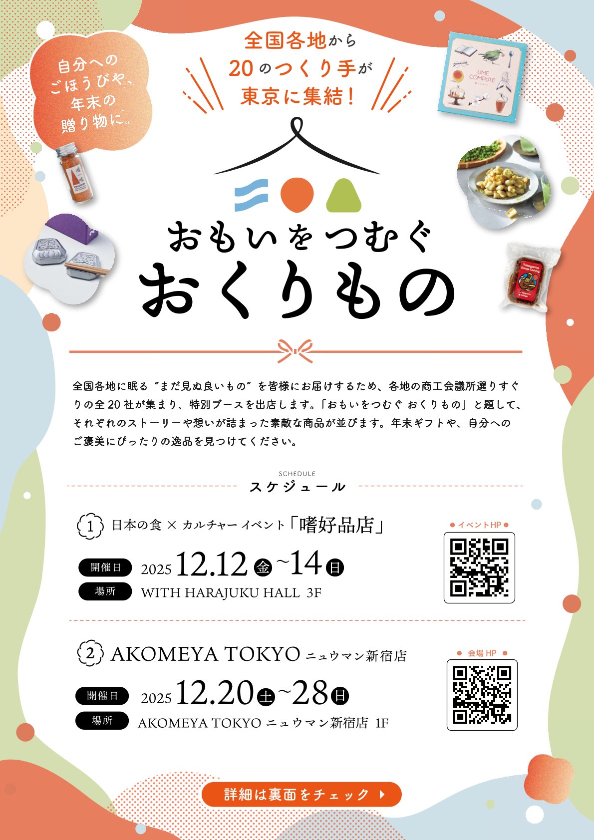 2025年度地域力活用新事業創出支援事業「ギフト市場への販路拡大に向けた商品磨き上げ事業」にて、首都圏で開催される展示販売会・店舗での期間限定ブースに、全国各地の商工会議所会員事業所20社が参加します。当日は「専門家による磨き上げされた商品」を中心に、日本各地の食や飲物、雑貨などが販売される予定です。